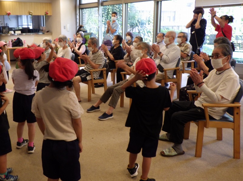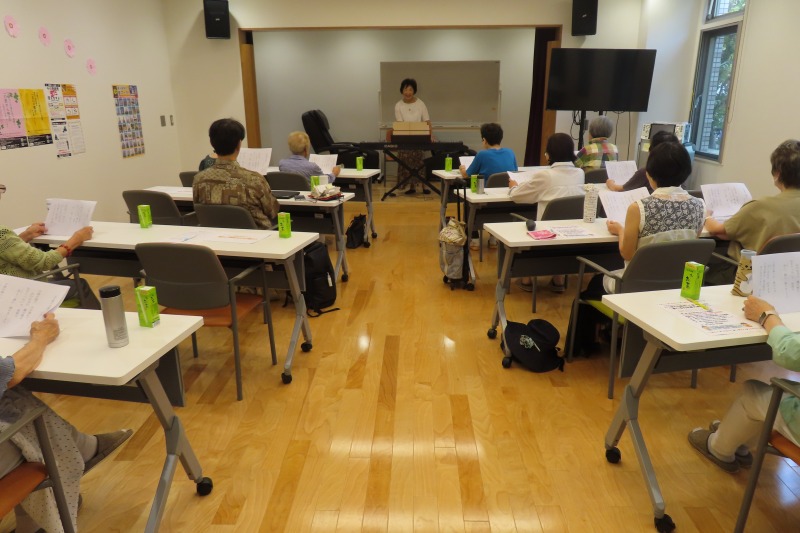 まずは肩や口の体操で体をほぐした後、キーボードの生演奏に合わせて『虫の声』、『月の沙漠』、『手のひらを太陽に』など9曲を歌いました。