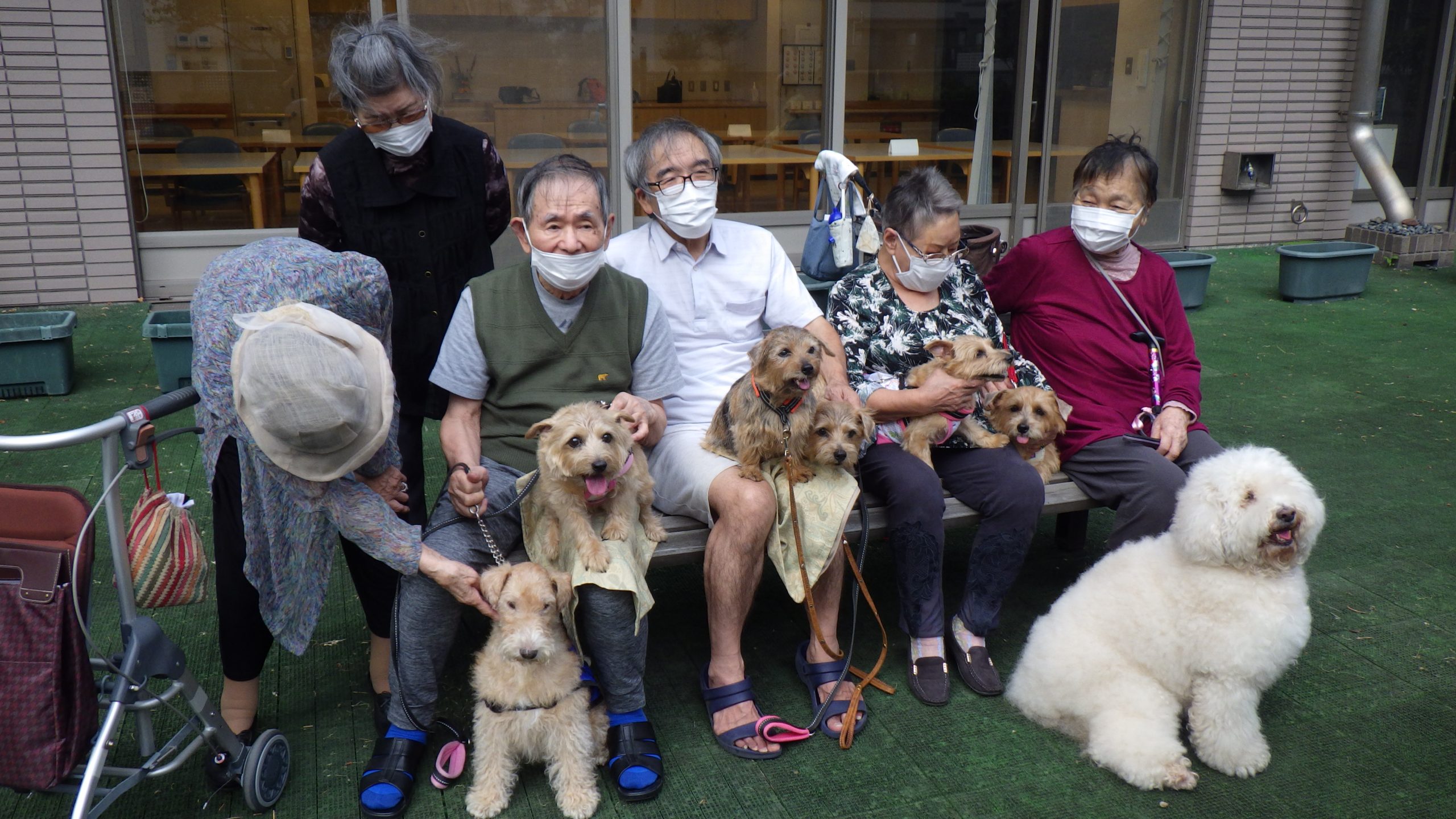 入居者の皆さまは愛らしいセラピー犬の姿に自然と笑顔がこぼれ、優しく撫でたり、膝に乗せたりと、楽しいひと時を過ごされました。