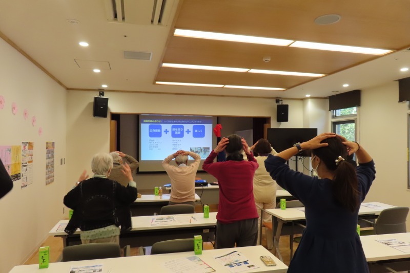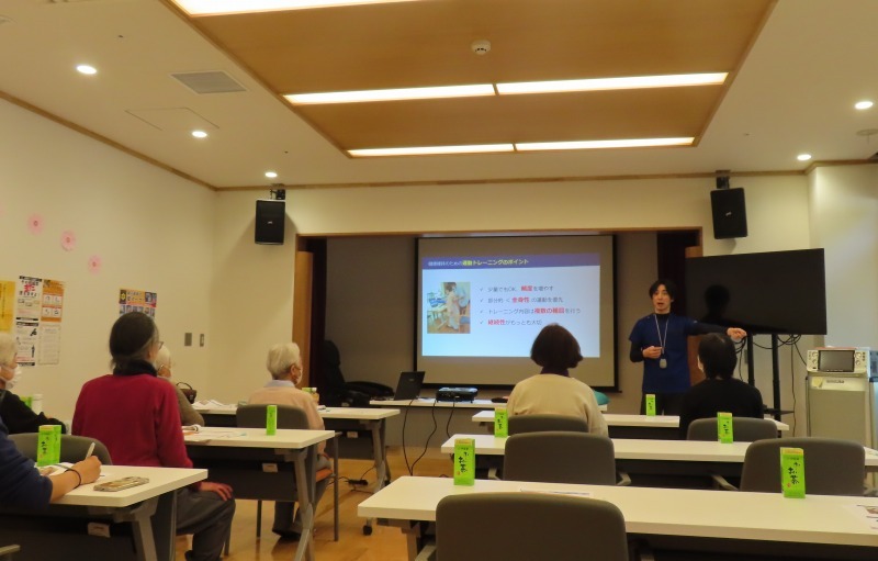 はじめに、認知症についてや認知症と運動の関係性などについての講義が行われ、その後は実際に体を動かしながら行う『二重課題トレーニング』を体験しました。